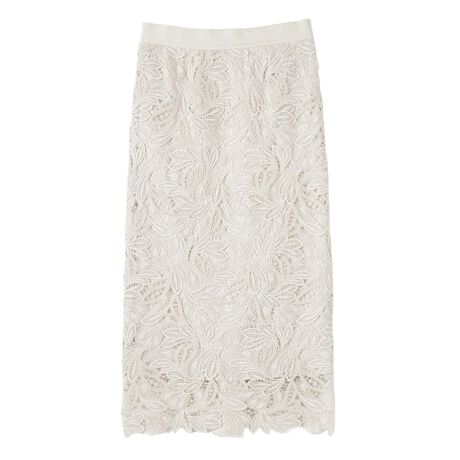 孔雀の羽をモチーフにしたコード刺繍の総レースが印象的なタイトスカート。