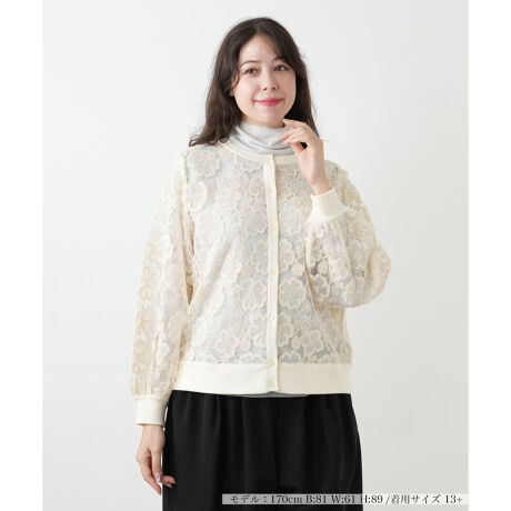 フラワーレースを主役にした、ロマンチックなデザインのカーディガン。前身頃と袖には華やかなレースを、後ろ身頃には伸縮性のあるニット素材を使用し、エレガントな透け感とリラックスした着心地を両立。軽やかな羽織りとしてはもちろん、フロントを留めればレースブラウスのような着こなしも楽しめます。コンパクトな丈感で、多彩なボトムスとコーディネートしやすい一枚です。