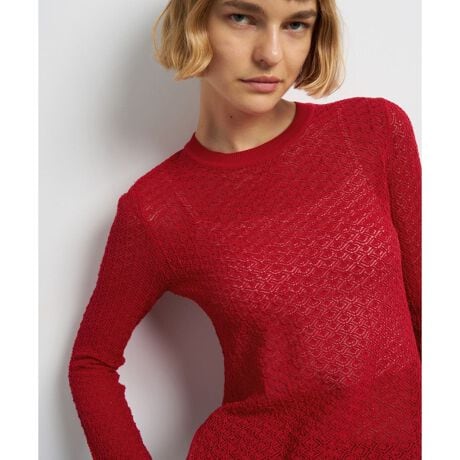 ドライタッチで清涼感あふれるコットン糸を使用し、繊細なレースのような柄をニットで表現した上品な一枚。