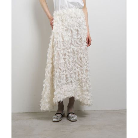 シンプルなトップスを合わせるだけで、一気に華やかで存在感のあるスタイリングが完成します。ウエストはゴム仕様で履き心地も快適。デザイン的にも目立ちにくいので、トップスをインしてもすっきりと見えます。自然に広がるフレアシルエットと、裾のランダムなカーブが、動くたびに優雅な表情を見せてくれます。