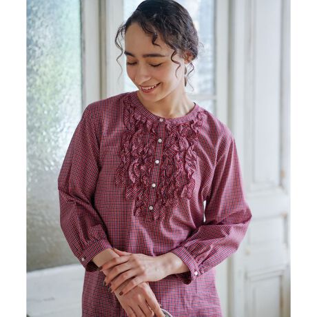 クラシカルな雰囲気を漂わせる、バンドカラーのチェックブラウス。胸元を飾るフリルが顔周りを華やかに見せ、ふんわりとした袖のシルエットもあいまって、フェミニンムードを残しつつヴィンテージ感を演出します。柔らかな風合いのコットン生地は程よい透け感があり、軽やかな印象を与えます。一枚で主役になれるデザインなので、シンプルなボトムスと合わせるだけで初秋のコーディネートが完成します。
