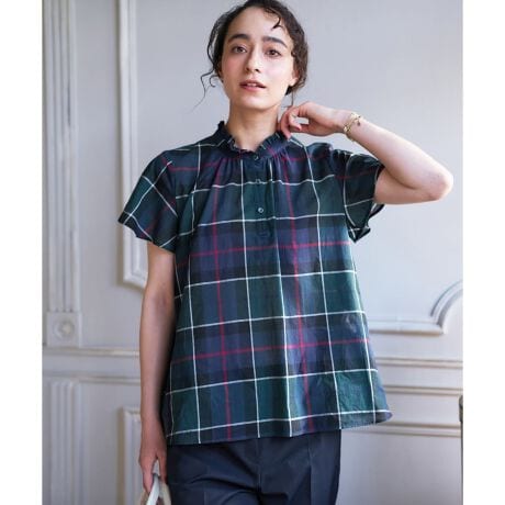 クラシカルなチェックが描かれたスタンドカラーブラウス。襟元にあしらわれたフリルがほんのり甘いエッセンスを加え、大人フェミニンなムードを演出。ギャザーからふわりと広がるシルエットが、体型をカバーしつつ柔らかな印象を与えます。さらりとした薄手のコットン生地を使用しているので、見た目にも涼しく、快適な着心地が感じられます。一枚で着映えするのはもちろん、カーディガンを重ねたレイヤードスタイルもおすすめ。