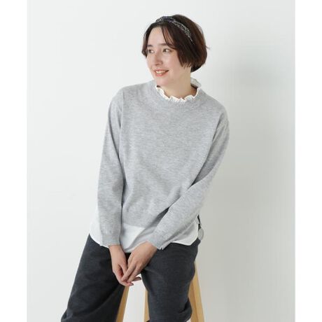 フリル襟ブラウスを重ね着したようなデザインの布帛ドッキングニットです。襟元と裾からのぞく布帛が価値観のあるデザイン。襟は取り外し可能なので、シーンに合わせて印象を変えていただけます。