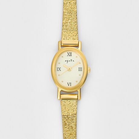 しなやかな輝きが手元を彩る、オーバルフェイスウォッチ繊細なツヤ感が魅力の板巻きベルトが、ジュエリーのような上品さを演出する腕時計。日常の動作に美しく馴染みます。フェイスはほんのり縦長のオーバル型。女性らしい柔らかさと洗練された印象を兼ね備え、手元を上品に引き立てます。カラーは、幅広いスタイルやシーンに合わせやすい3色展開。自分らしい一本がきっと見つかります。※板巻きベルトは構造上多少の隙間があります。※メッキを施してありますので、メンテナンスは研磨剤の入っていない柔らかい布をご使用ください。※時計に予め組み込まれている電池は、工場出荷時に機能や性能を確認する為のモニター用電池となっております。モニター用電池寿命による電池交換の場合につき、お買い上げより1年間無償となります。お買い上げ納品書と販売証明書と保証書はお手元にて保管いただけますようお願い申し上げます。◆ケース:ステンレス(ゴールドメッキ)◆裏蓋、リューズ:ステンレス(ゴールドメッキ)◆ベルト:ステンレス(ゴールドメッキ)◆風防:ミネラルガラス◆文字盤:真鍮