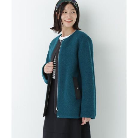 クルーネックのスライバージャケットです。今期は前開きジップデザインでおつくりしています。前端・ポケット部分の別布使いもポイントです。