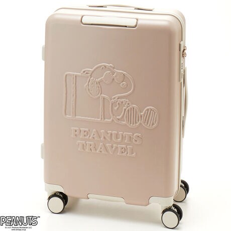 スヌーピーやオラフがエンボスデザインされたジッパータイプのスーツケース。内装はスヌーピーと仲間たちがいっぱいの賑やかなコミックデザイン。ファスナートップにはPEANUTSロゴが刻印されています。