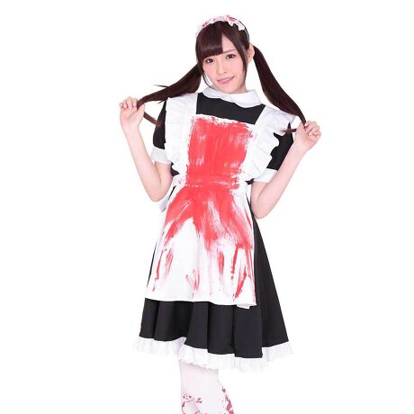 [型番:H0140BK]クラシカルなメイド服に大胆な血糊風デザインを施した、インパクト抜群のホラーコスチューム。フリル付きエプロンとヘッドドレスで可愛らしさを残しつつ、赤いペイント調のプリントがダークな雰囲気を演出します。ハロウィンやホラーパーティー、舞台衣装などに最適で、写真映えすること間違いなし。怖さと可愛さを兼ね備えた、他では見つからないユニークなメイドスタイルです。