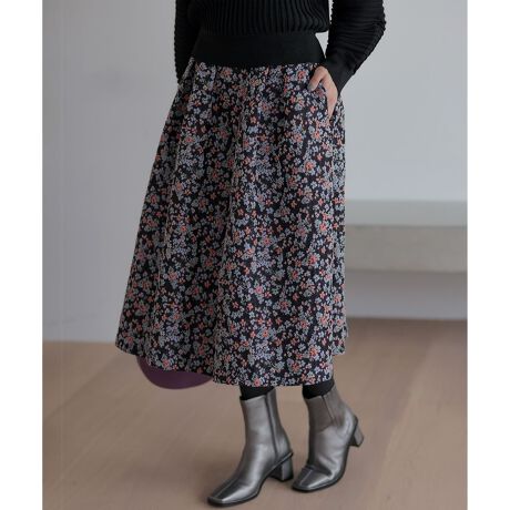 ■デザイン・ランダムタックのボリュームスカートは1枚で華やかスタイルが叶います。・ウエストベルト後ろにはゴムを使用しているので程よいフィット感があります。・艶のある多色使いの小花のジャカードは様々なカラーのニットと相性が抜群です。