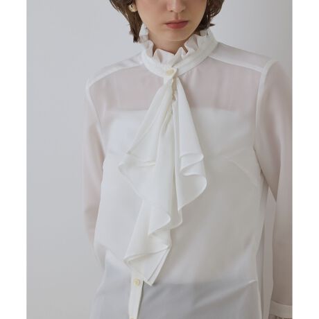 コーディネートが品よく着映える、クラシカルなムード漂うラッフルブラウス。ポリエステル100%の落ち感のあるしなやかなブラウス素材を使用。 前立てに添えた大きなラッフルと首元のフリルが顔回りを華やかに演出してくれる一枚です。