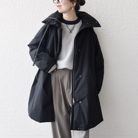 テントラインとバルーン風のシルエットがフェミニンな印象のフード付きコート。