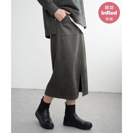 快適な履き心地ときれい見えを兼ね備えた、フェイクスエードがポイントのスカート。