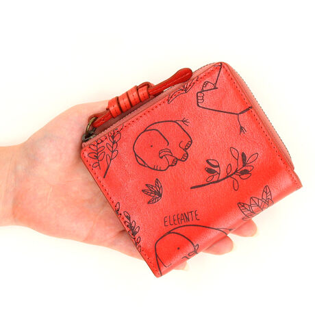 [型番:31781]ゆったりと自由気ままなゾウ達がモチーフのイタリアンレザーのシリーズです。好物を食べたり、かくれんぼをしたり、自由気ままなゾウ達を手書きタッチのイラストで表現しました。イタリアンレザーの表面をレーザーで焦がす技法を用いて、手書き風に表現した遊び心いっぱいのお財布です。