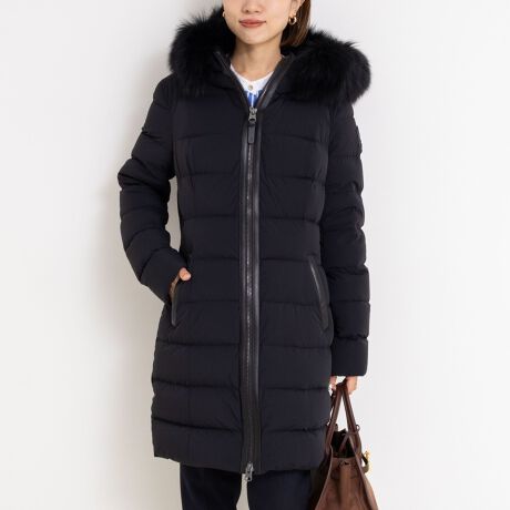 ・着ぶくれしない細見えシルエット品のいいマットな表地にレザーを配したラグジュアリー感漂う一枚