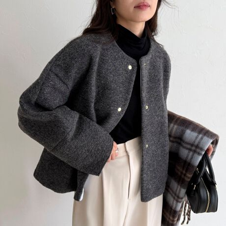 ・空気を含んだようなエアリーな質感でさらりと羽織れるノーカラーブルゾン