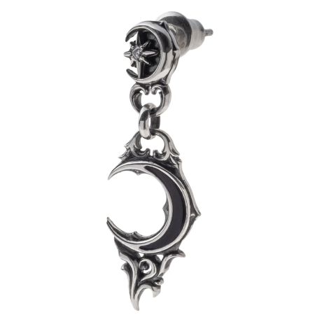 三日月モチーフは、トレサリー風のレイヤードデザインに仕上げられ、シンセティックオニキスをセッティング。星が瞬くスタッドや下部の唐草模様が揺れるたびに繊細な輝きを放ち、耳元に優雅なリズムを添えます。裏面にはブランドロゴ、925、3つのホールマークを刻印。さらに、青緑色の染色大理石バージョンと組み合わせることで、ハート型を描くペアデザインとしても楽しめます。同シリーズのペンダントと組み合わせれば、月の神秘が息づくトータルコーディネートの完成です。※1個売り(片耳分)。