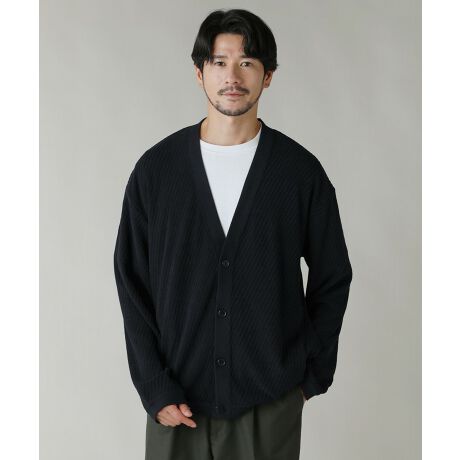 素材は丈夫なポリエステルをメインにポリウレタンを2%混紡し、適度なストレッチ性をプラスしました。リブの節目ごとに透け感を持たせているため重たい雰囲気にならず、軽やかにご着用いただけます。季節を跨いで長い間ご着用いただけるやや薄手の生地感で、春先や秋口など季節の変わり目や、室内でのちょっとした羽織りとしても重宝するアイテム。また、冬物のアウターを羽織った時にもごわつくことがないため、合わせ方次第で春・秋・冬と3シーズン活躍するマストバイなカーディガンです。