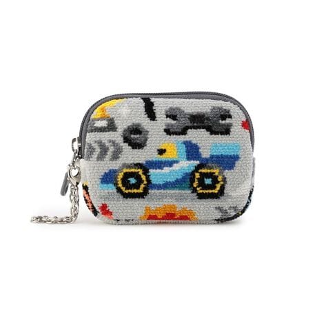『ラブラリーサーキット』のチャームポーチです。疾走するレーシングカーをモチーフに、遊び心のある柄に仕上げました。バッグのハンドルに取り付けられるチェーン付きで、持ち運びにも便利です。小物類をコンパクトに収納できます。車好きな方へのギフトとしてぜひ選んでいただきたい一品です。
