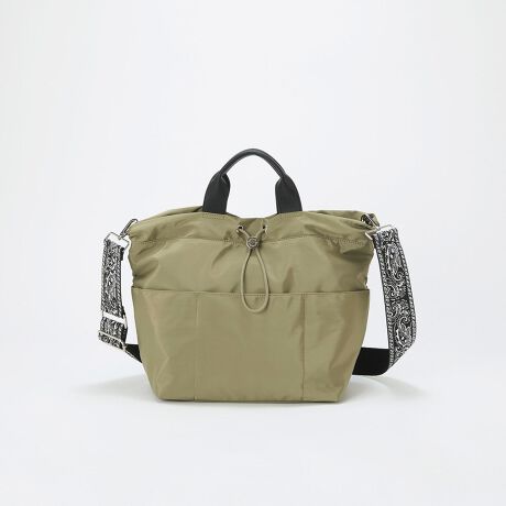 舟形トートとしてはもちろん、口元のコードを絞ると巾着バッグにチェンジ。