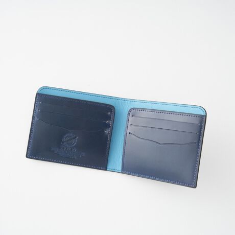 レーデルオガワ社製コードバンの凛とした艶を、日常使いに心地よい二つ折りへ。構造をシンプルにすることで開きがよく、お札の出し入れがよりスムーズに。内側のカードポケットにもコードバンを配し、手の内で感じる高級感を一層引き立てます。外側にスナップ小銭入れを配置することで本体の厚みを抑え、ジャケットやミニバッグでも美しく収まります。