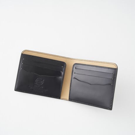 レーデルオガワ社製コードバンの凛とした艶を、日常使いに心地よい二つ折りへ。構造をシンプルにすることで開きがよく、お札の出し入れがよりスムーズに。内側のカードポケットにもコードバンを配し、手の内で感じる高級感を一層引き立てます。外側にスナップ小銭入れを配置することで本体の厚みを抑え、ジャケットやミニバッグでも美しく収まります。