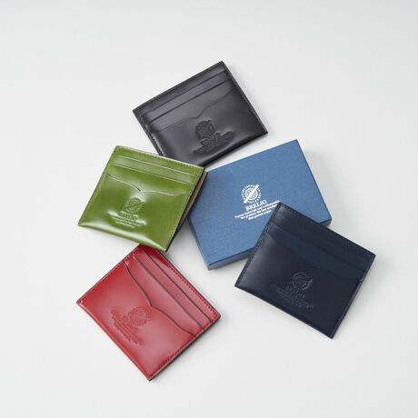 レーデルオガワ社製コードバンを贅沢に使用した、スリムなカードケース札入れです。左右に3つずつ計6枚のカードポケットを備え、中央ポケットには折り畳んだ紙幣も収納可能。マチを省いた設計でポケットへの収まりもよく、スーツスタイルにも自然に溶け込みます。持つたびに感じる上質な手触りと、コードバンならではの深い艶が、使い込むほどに味わいを増します。