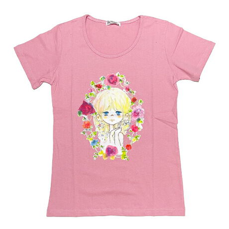 水森亜土 お花の少女柄 プリント半袖Tシャツ(L) ローズピンク アパレル
