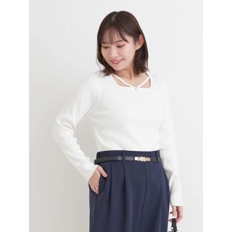 ・ネックレスいらずの顔周りに華やかなアクセントをプラスしてくれるビジュー付きデザイン。