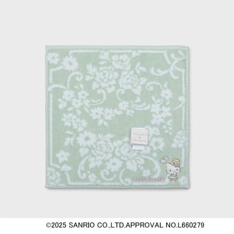 ローラ アシュレイのアーカイブ柄「Josephine」にハローキティのワンポイント刺繍が可愛らしいタオルハンカチ。
