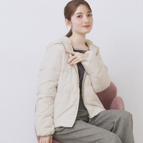 河田ダウンを使用した着ぶくれしないペプラムライトダウンジャケット。