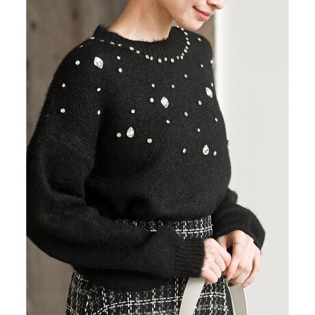 大小のビジュをちりばめたキラキラ輝くニットプルオーバー。
