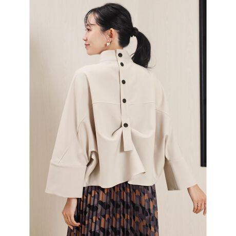 釦の付け位置により立体的なタックシルエットを作り出すことができ、位置を変えればベーシックなフラットなルックスにもチェンジ可能な2way仕様。