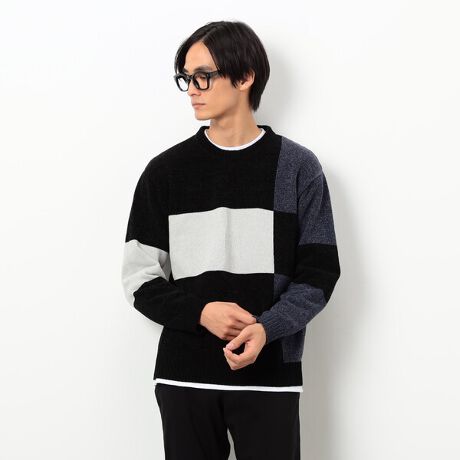 ミドルゲージ(7ゲ−ジ)のインターシャ編みで仕上げたコムサイズムの定番的なカラーブロッキングデザインです。
