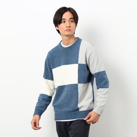 ミドルゲージ(7ゲ−ジ)のインターシャ編みで仕上げたコムサイズムの定番的なカラーブロッキングデザインです。