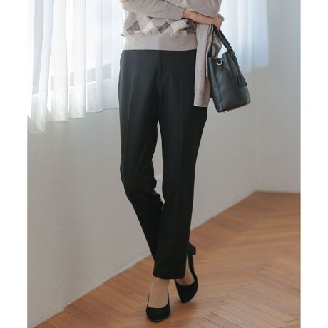 ■デザインセンタープレス入りで、きれいめな印象のテーパードパンツ。後ろウエスト部分はゴム入りのため、快適な穿き心地と動きやすさを叶えます。脚をスッキリと見せる細みのシルエットで、ボリューム感のあるトップスとも相性抜群です。シンプルなデザインのため、デイリーからオフィスまで幅広く活躍します。裏地なしです。