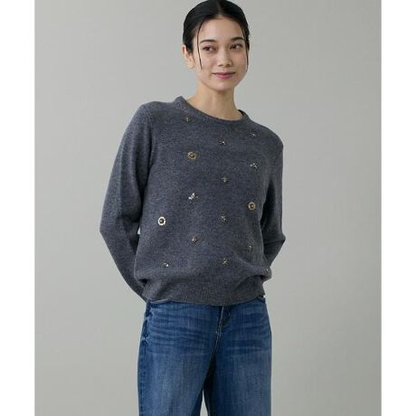 クルーネックビジュー風刺繍ニット