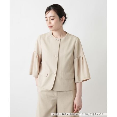 ほどよい凹凸感のある素材を使用したノーカラージャケット。さらりと軽く、しなやかで落ち感のある生地が、きちんと感の中にもやわらかな印象を添えます。袖は切り替えからギャザーを寄せ、ふんわり広がるシルエットに。フロントには同色のクルミボタンを配して、ディテールまで上品に仕上げました。前身頃のみ裏地付きで、すっきりと心地よく着られる一着。同素材のパンツと合わせて、セットアップとしても着用可能です。