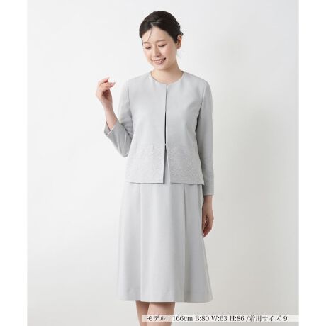 ノーカラージャケットとミディ丈スカートを組み合わせた、端正ながらも柔らかさを感じさせるスーツ。ジャケットの袖口と裾には繊細なフラワーモチーフのチュールをあしらい、上品なアクセントをプラス。すっきりとしたネックラインとホック開閉のフロントが洗練された印象を与えます。スカートは落ち着いたフレアシルエットで、右サイドには実用的なポケット付き。セレモニーやオケージョンに、品格と華やぎを添える一着です。
