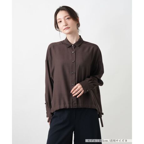 滑らかな風合いと落ち感のある素材で仕立てられた、シンプルな無地の襟付きブラウス。すっきりとしたコンパクトな襟元が特徴で、きゅっと絞れるドローストリング入りの前裾はシルエットにニュアンスをプラス。後ろ裾はやや長めに設計されており、ヒップラインをカバーしつつ、横から見た姿にもナチュラルな動きを演出します。オンにもオフにもすっとなじむ、ミニマルだけど表情豊かな一枚です。