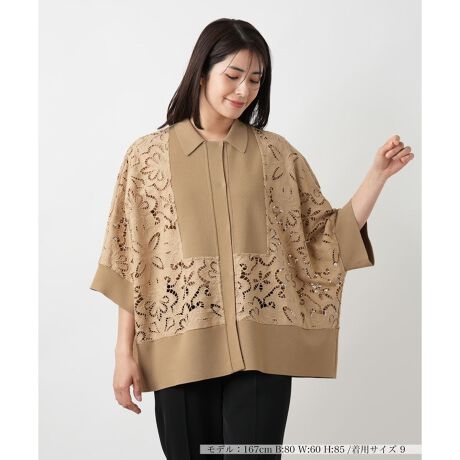 繊細なカットワークレースとニット素材を組み合わせた、表情豊かなオーバーサイズブラウス。柔らかなニットの土台に、花柄モチーフのカットワークレースがふんわりと重なり軽やかな陰影を描き出します。ドルマンスリーブのゆとりが動きにしなやかさを与え、身体をふんわりと包み込むシルエットに。前開きはスナップボタン仕様で着脱しやすく、羽織りとしても活躍。カジュアルにもきれいめにも寄り添うデザインで、コーディネート次第で多彩な表情を楽しめるトップスです。