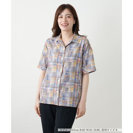 ランダムに重ねたようなグラフィカルチェックが、コーディネートに明るさを添えるシャツブラウス。清涼感のあるポリエステルとコットンをブレンドした素材が、さらりと軽やかな着心地を実現します。ウエスト両サイドにはシンプルなスリットポケットをレイアウト。シルエットにはゆとりをもたせており、ヒップにかかる丈感が動きやすさと快適さを両立。シンプルなパンツに合わせるだけで、夏らしい表情に仕上がります。