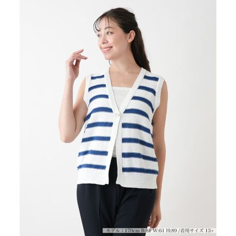 ナチュラルな風合いのコットンにナイロンをミックスし、ざっくりと編み上げた軽やかなニットベスト。ほんのり煌めくスパンコールやボーダーがやさしく映え、夏のスタイリングに爽快なアクセントを添えます。シャープに開いたネックラインが顔まわりをすっきりと見せ、フロントは1つボタン仕様となっており、タンクトップやTシャツとのレイヤードにもぴったり。パンツでもスカートでもバランス良く決まり、涼しげでリラックス感のある着こなしが叶います。