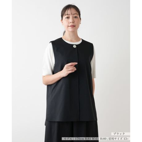 繊細な織り柄がさりげなく表情を添える、上品な印象のノーカラーベスト。襟元には一粒の貝調ボタンをあしらい、控えめながらも凛としたアクセントに。裾はサイドスリットで前後差をつけてシルエットに動きをプラスし、すっきりとしたIラインにほどよい抜け感を与えています。同素材のボトムと合わせたセットアップはもちろん、カットソーやブラウスに重ねるだけで上級者らしいレイヤードスタイルが完成するトップスです。