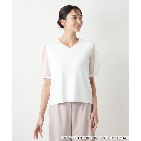 すっきりとしたVネックに、ほんのり透ける異素材のシアースリーブが華やかさを添えるニットトップス。ニット地のボディはコンパクトに、袖部分はふんわりと軽やかに広がるボリュームシルエットで、インパクトたっぷりのコントラストを演出。ひと味違ったセンスを引き立て、オンにもオフにも頼れるアイテムです。女性らしさと抜け感をほどよく両立した、大人のコーディネートが楽しめます。