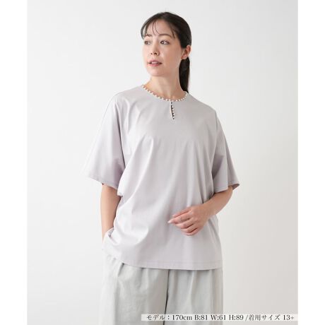 パール調ビジューが控えめながらもネックまわりにあしらわれ、さりげない輝きが装いに華を添えるカットソー。スキッパーのフロントはループボタンにより開閉が可能。滑らかなコットン素材で仕立てられた、着心地のよさと品のよさを兼ね備えた一枚です。肩のラインを落としたゆったりドルマンスリーブのシルエットは、リラクシーながらも洗練された印象に。オンにもオフにも活躍する、ワードローブに用意しておきたいトップスです。
