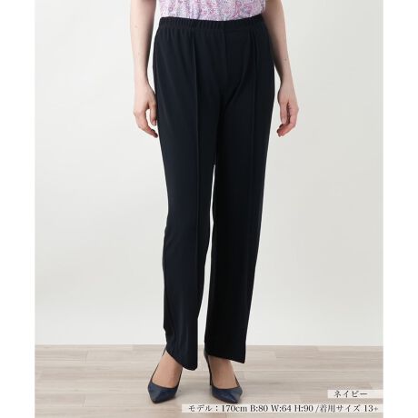 ストレスフリーなはき心地と、きちんと感のある佇まいを両立したシンプルな無地のパンツ。ウエストは総ゴム仕様で締め付け感がなく、伸縮性のあるやや薄手の生地が軽やかにフィット。シルエットはすっきりとしたストレートラインを描き、程よいリラックス感がありながら、縦のラインを強調するセンターシームで脚のラインをスマートに見せてくれます。きれいめにもカジュアルにも、フレキシブルに活躍する一本です。