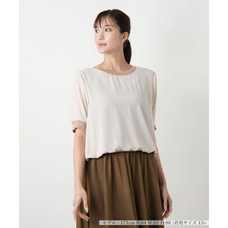 柔らかな透け感のある身頃に、ネックライン、裾、袖口のリブがアクセントを添えるプルオーバー。異素材の組み合わせが、シンプルながらも洗練された印象を演出します。首元は控えめな開き具合で、きちんと感を保ちつつ、顔まわりをすっきりと見せてくれるデザインに。ほどよいゆとりと落ち感のあるシルエットで、身体のラインを拾いにくく、暑い季節も快適な着心地です。スカートにもパンツにも合わせやすく、きれいめな装いからカジュアルまで幅広く活躍。手洗い可能なイージーケアも嬉しいポイントです。