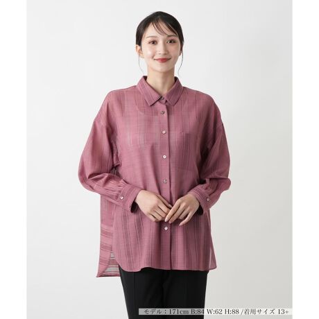 うっすらと浮かぶような繊細な透かしストライプが軽やかな印象のブラウス。さらりとした素材感が肌に心地よく、これからの季節にぴったりの涼やかな着心地を叶えます。ボタンを上まで留めても、羽織りとしてラフに着てもサマになり、フレキシブルに着回せるデザインが魅力です。サイドスリットとラウンドヘムが動きに合わせて表情を変え、後ろ姿にもニュアンスをプラスします。