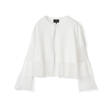 袖と裾に繊細なレースをあしらった、レース切替ニットカーディガン。