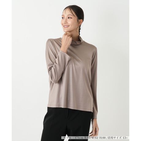上質な素材が生み出す、ほのかな光沢感が美しいタートルネックカットソーです。首元を優しく包み込むデザインは、肌寒くなる季節に暖かさをもたらします。長袖ですので、一枚で洗練されたスタイルを楽しむのはもちろん、ジャケットやカーディガン、ワンピースのインナーとしても幅広く活躍します。柔らかな肌触りで、一日中快適にお過ごしいただけます。着回し力に優れ、オフィスから日常使いまで様々なシーンに馴染みます。ご自宅で手洗いができるウォッシャブル仕様のため、日々のお手入れも簡単で、長くご愛用いただけます。