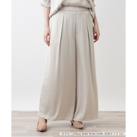 微光沢の生地が動くたびに繊細なニュアンスを描くワイドパンツ。しなやかで落ち感のある素材が縦ラインをきれいに整え、レッグラインをすっきりと見せてくれます。ウエストは後ろ部分のみゴム仕様で、見た目はすっきりとしたまま、程よいフィット感と着脱のしやすさを両立。ヒップから腿部分にかけてはゆとりを持たせたシルエットで身体のラインを拾いにくく、リラクシーなはき心地を実現します。トップスをタックインすればウエストまわりが引き締まり、自然なスタイルアップ見せ効果も期待できそうです。